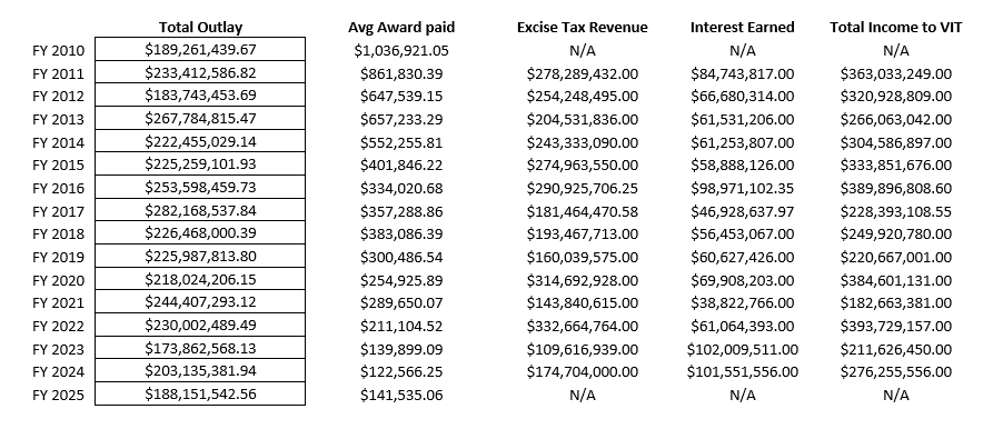 Below is an abbreviated chart showing annual outlays (compensation, legal fees, and expert costs), average damage awards, and revenue received by the Vaccine Injury Trust Fund (VIT).